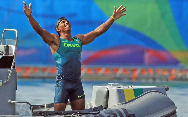 Isaquias queiroz levanta as mãos para o céu e celebra a medalha, segundo nos jogos (foto: